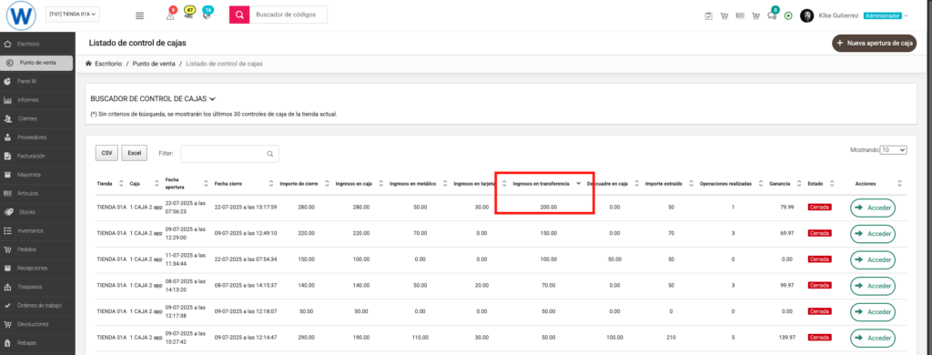 AÑADIDA COLUMNA «INGRESOS POR TRANSFERENCIA» EN LISTADO DE CONTROL DE CAJAS